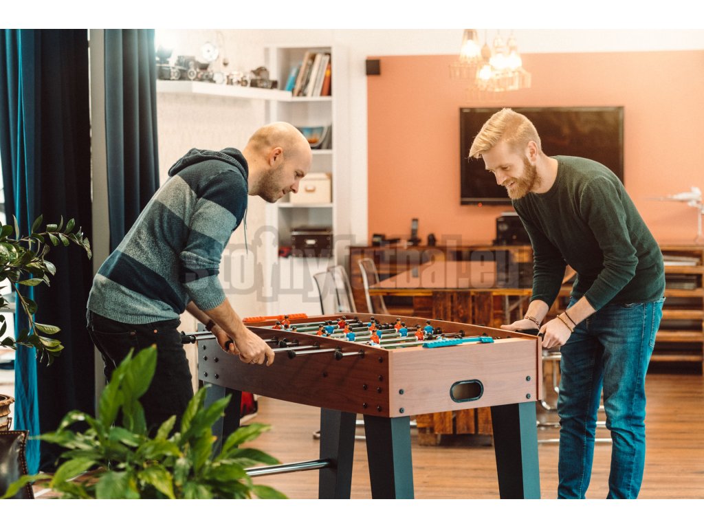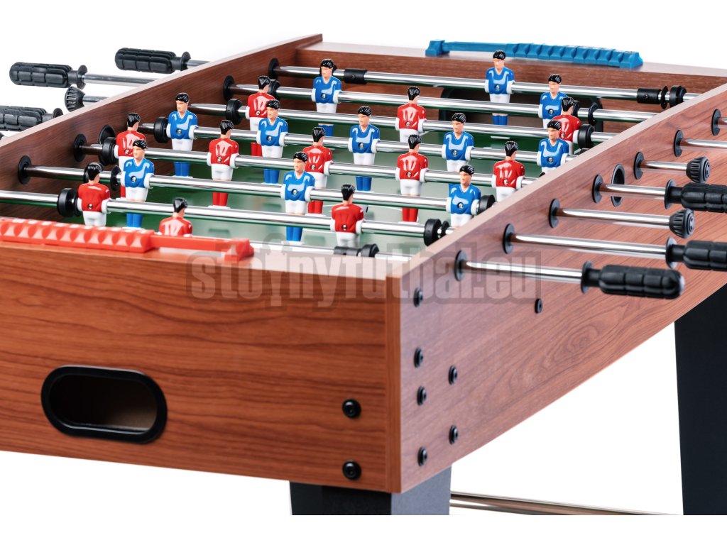 Krásny vzhľad tmavého dreva moderne tvarovaného korpusu stolného futbalu v kombinácii s čiernymi nohami stola upúta každý zrak v miestnosti. Pochrómované duté oceľové tyče s priemerom 13 milimetrov sa ticho pohybujú v nylonových klzákoch.