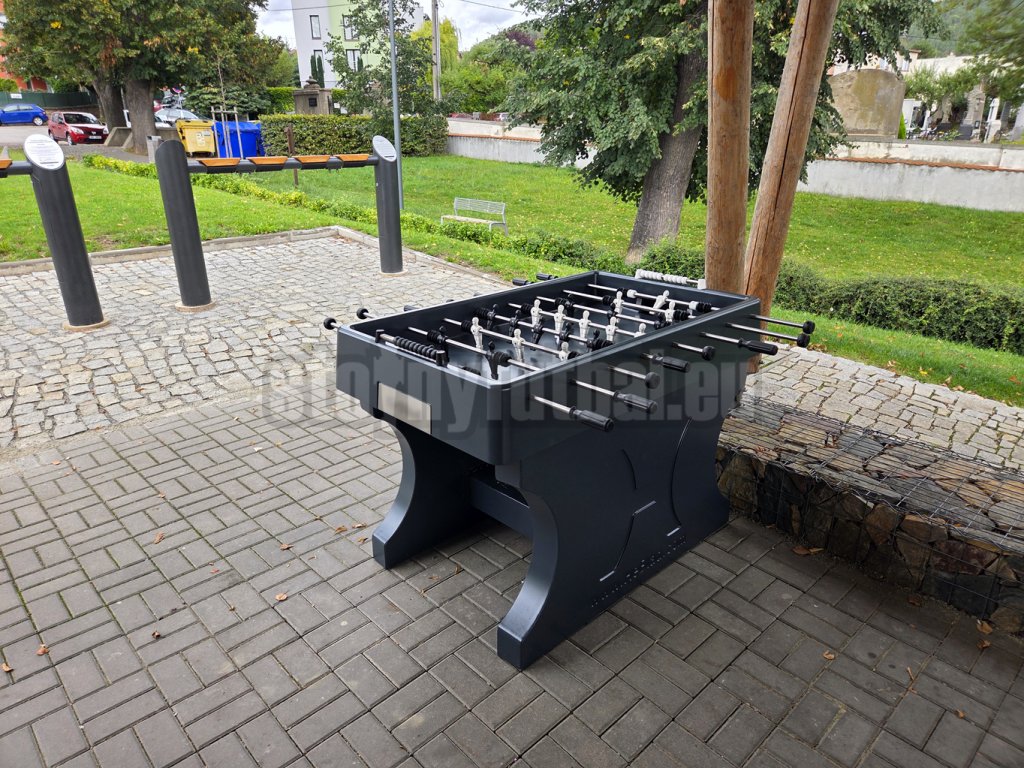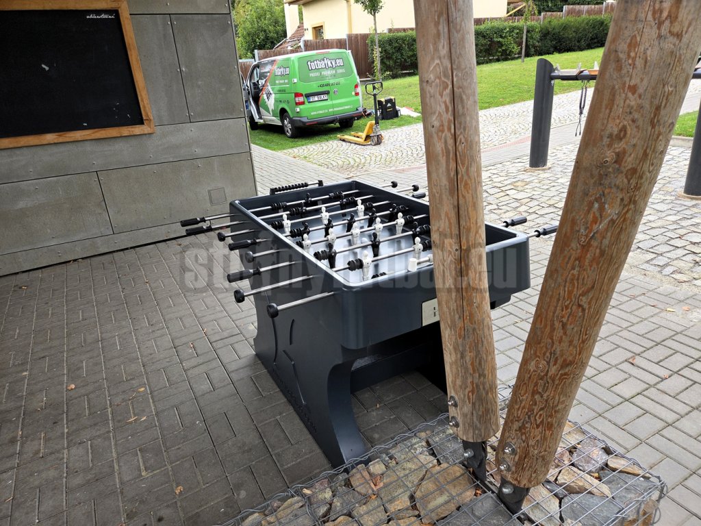 Stôl je navrhnutý s dôrazom na detail a praktickú funkčnosť. V rohoch hracej plochy je mierny sklon, ktorý umožňuje ľahký odtok dažďovej vody. V spodnej časti bránok sú otvory, ktoré zabezpečujú, že sa voda nehromadí ani počas dažďa, takže stôl je vždy pripravený na hru. Čierno-bieli hráči a zodpovedajúce počítadlá dotvárajú elegantný vzhľad stola v antracitovej farbe.