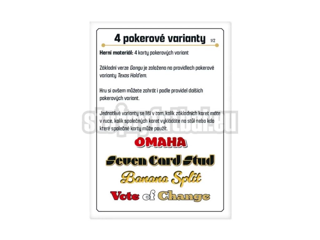 V balení nájdete celkovo 10 kariet, ktoré do hry pridávajú 4 pokerové varianty a 2 žolíkové karty. Vďaka tomu sa každá partia môže vyvíjať inak a hra získava väčšiu variabilitu aj znovuhrateľnosť. Žolíci dokážu výrazne zamiešať stratégiou, zmeniť odhady sily kombinácií a priniesť do hry nové napätie. Hráči tak musia byť ešte lepšie zohraní, lepšie čítať situáciu a pružne reagovať na vývoj partie.