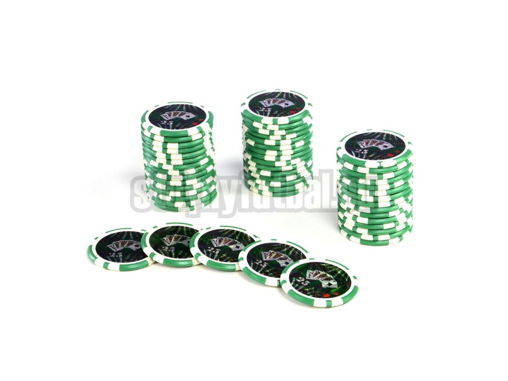 50 ks poker žetónov v hodnote 25 o váhe 11g s kovovým jadrom a skosenými hranami - ideálny na triky so žetónmi.