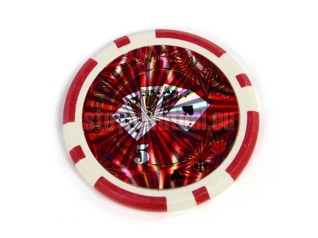 Červené luxusné žetóny na poker Ocean majú holografický povrch a kovové jadro.
