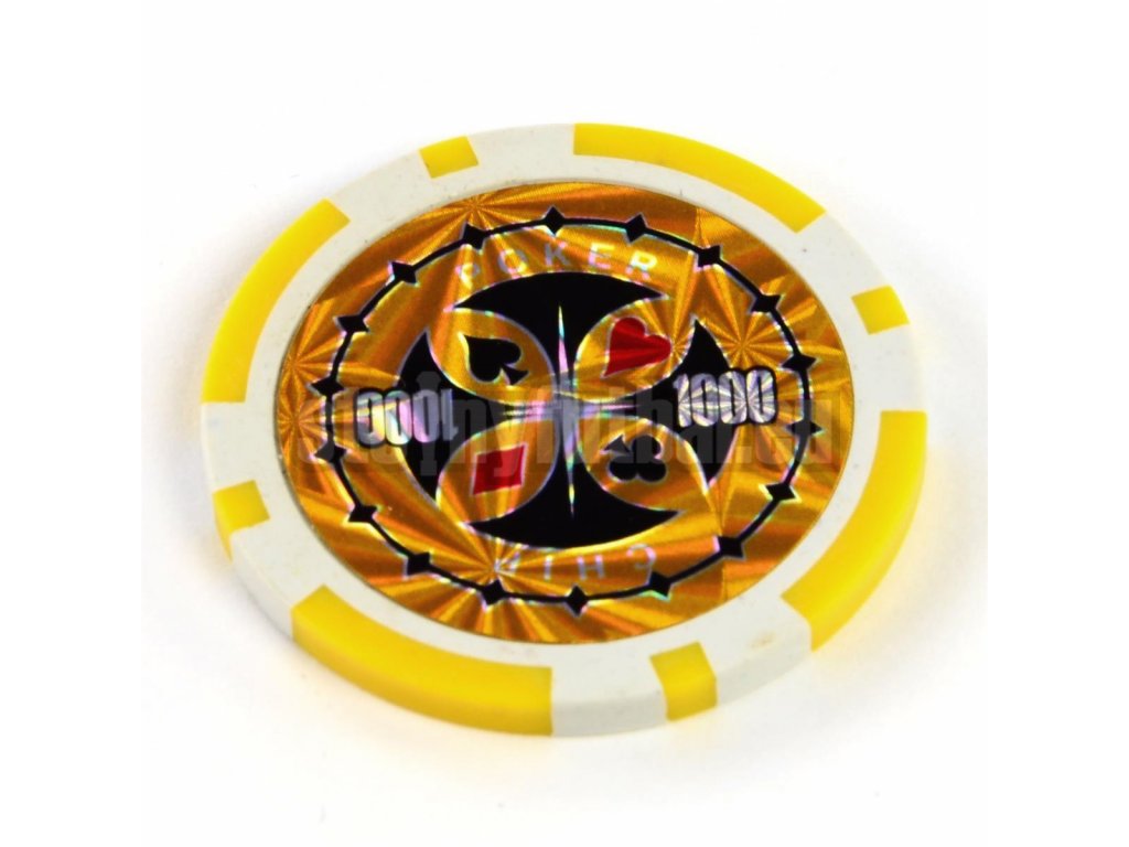 Žlté luxusné žetóny na poker Ultimate majú holografický povrch a kovové jadro.