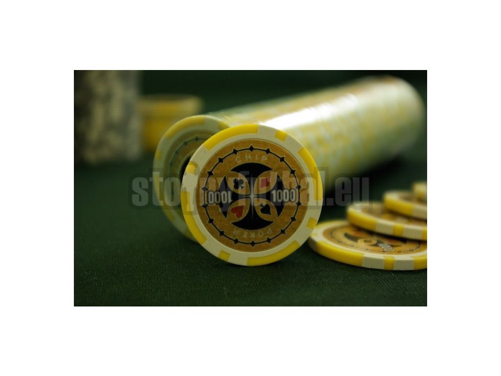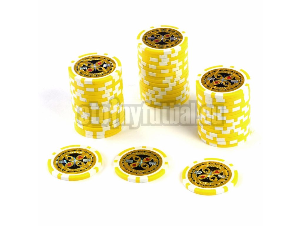 50 ks poker žetónov v hodnote 1000 o váhe 12g s kovovým jadrom.