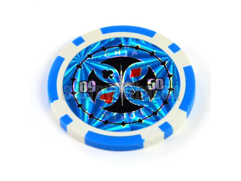 50 ks poker žetónov v hodnote 50 o váhe 12g s kovovým jadrom.