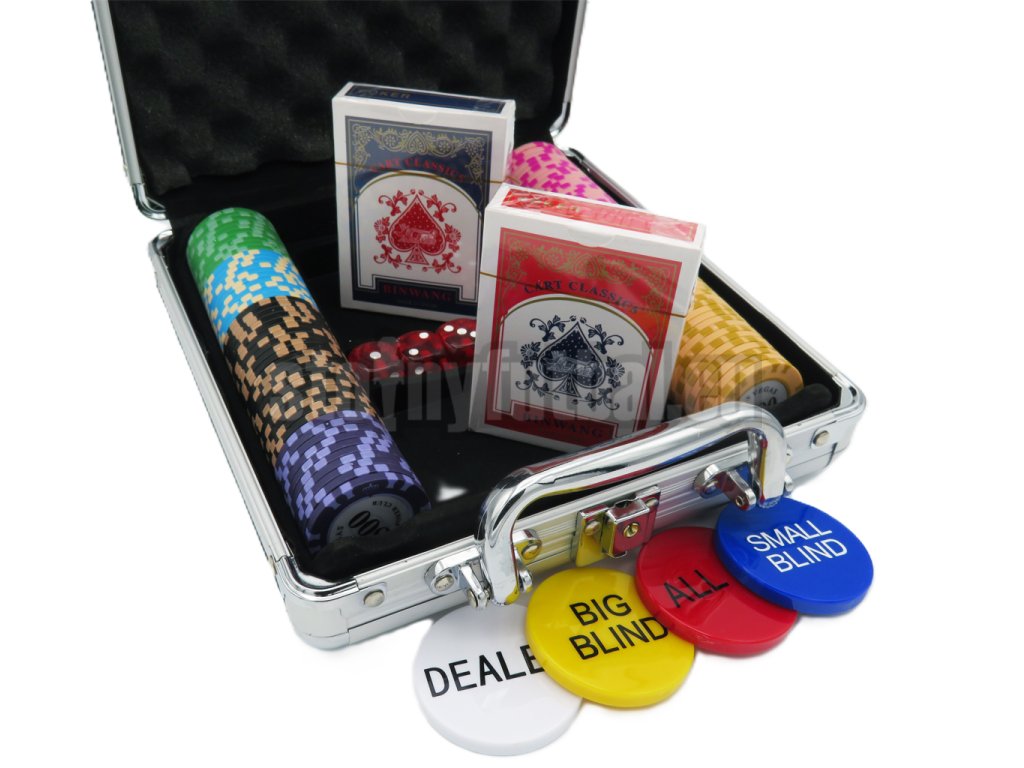 - Kompletní príslušenstvo : Sada obsahuje 2 balíčky 54 karet , 5 kociek a speciální žetóny DEALER, ALL IN, SMALL BLIND a BIG BLIND na pohodlné řízení hry.