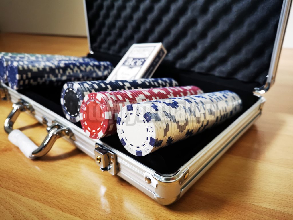 Kompletná pokerová súprava s 300 žetónmi, 2 sadami kariet, 5 hracími kockami a 1 žetónom krupiéra uložená v hliníkovom kufri.