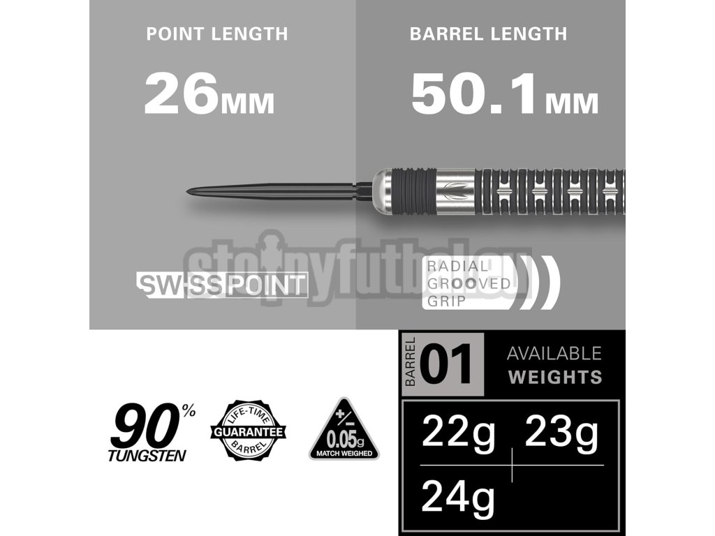 - Materiál: 90% volfrámu pre vyššiu odolnosť a lepší pocit pri hádzaní