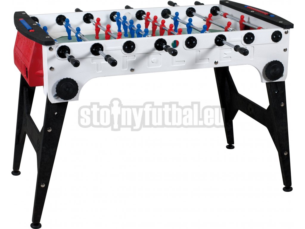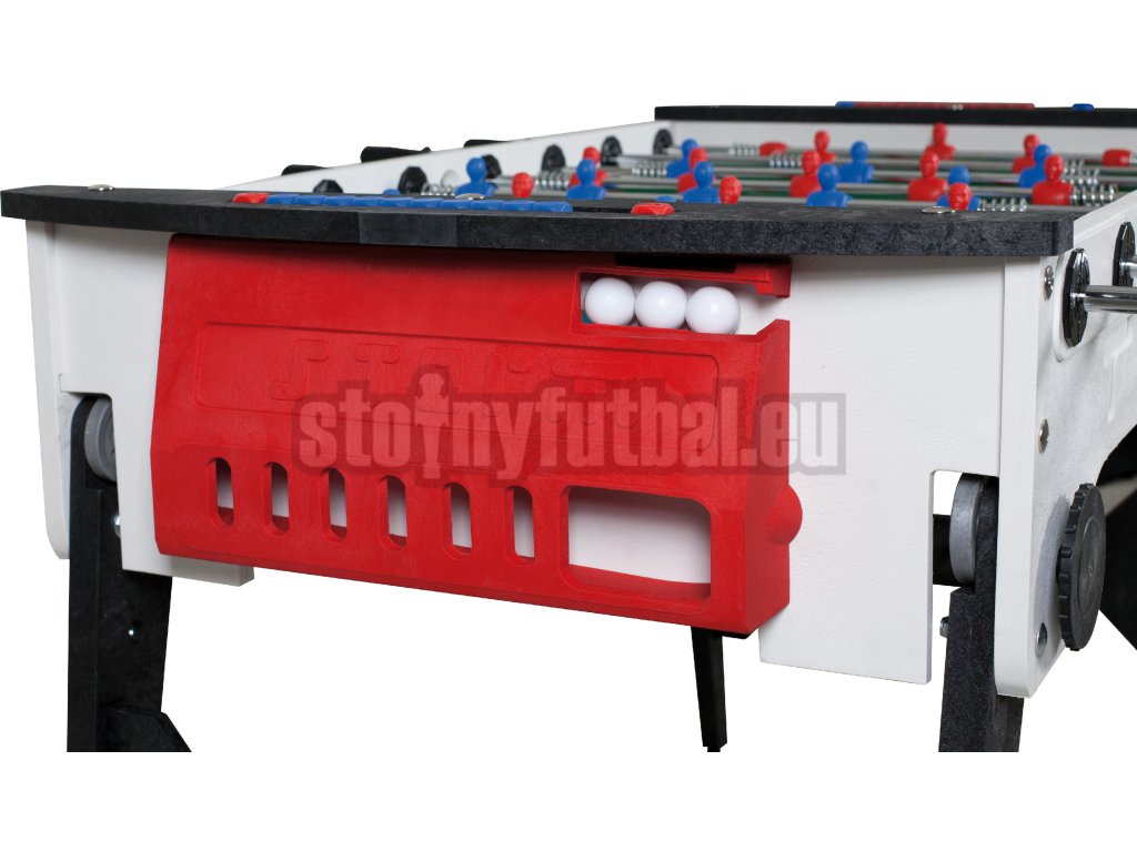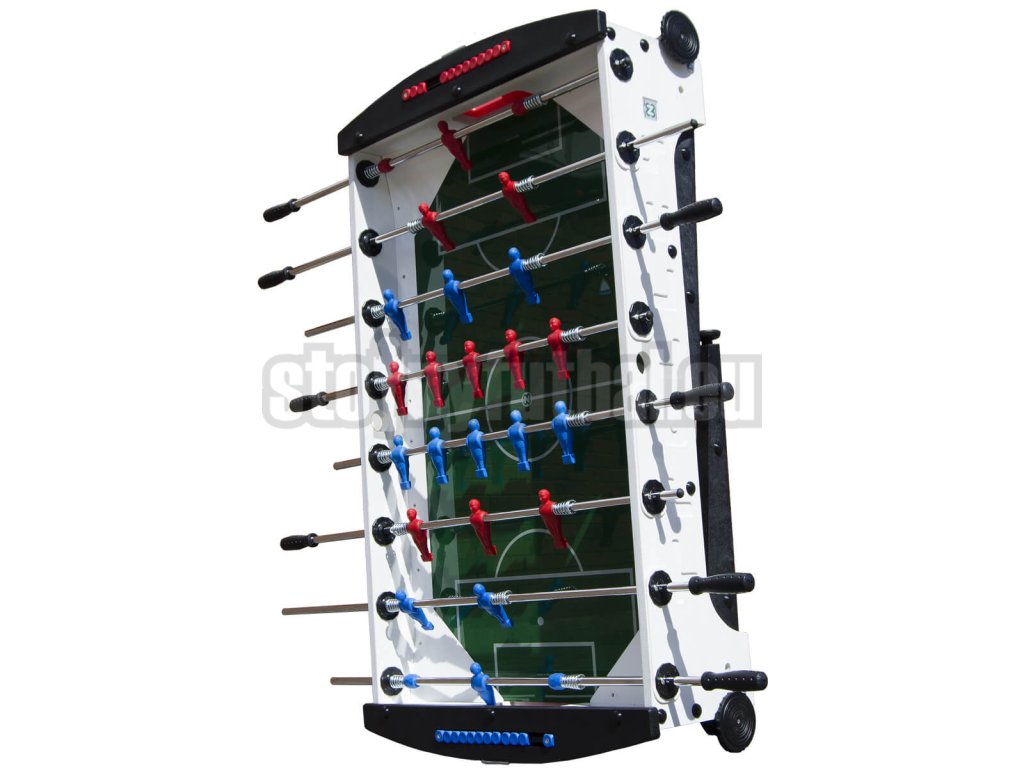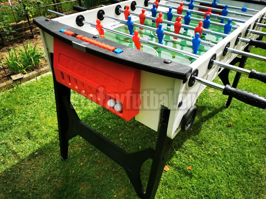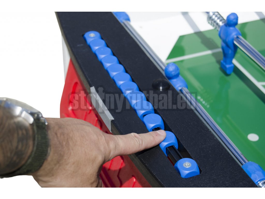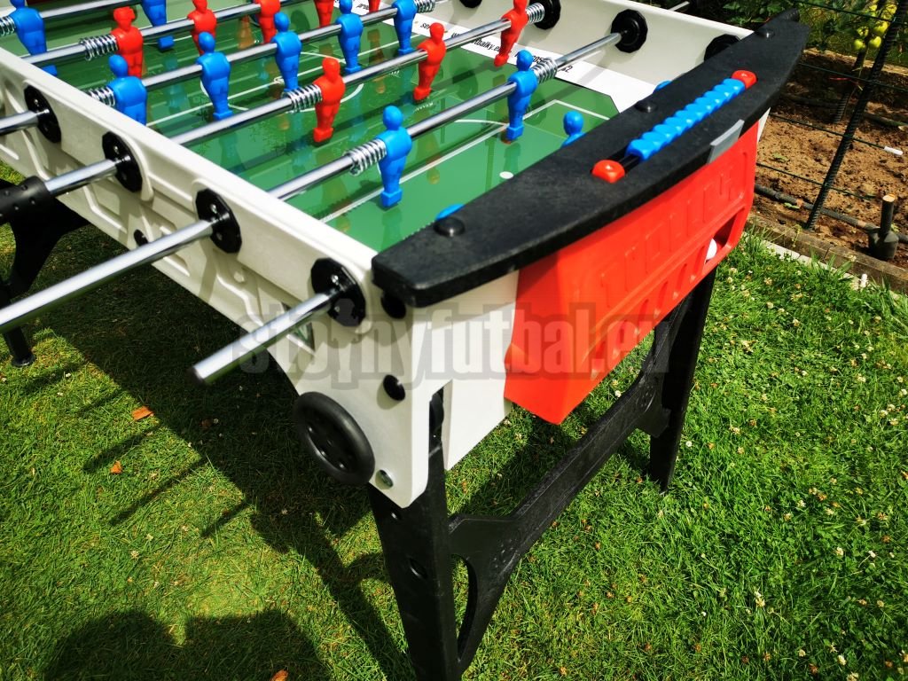 Obzvlášť odolné dvojito pochrómované 16mm priechodné tyče sú vybavené špeciálnymi tlmiacimi pružinami smerom k stene korpusu futbalu a optimálne beží v klzných ložiskách odolných voči poveternostným vplyvom. Červené a modré figúrky sú nalisované na hracej tyče a sú extrémne odolné.